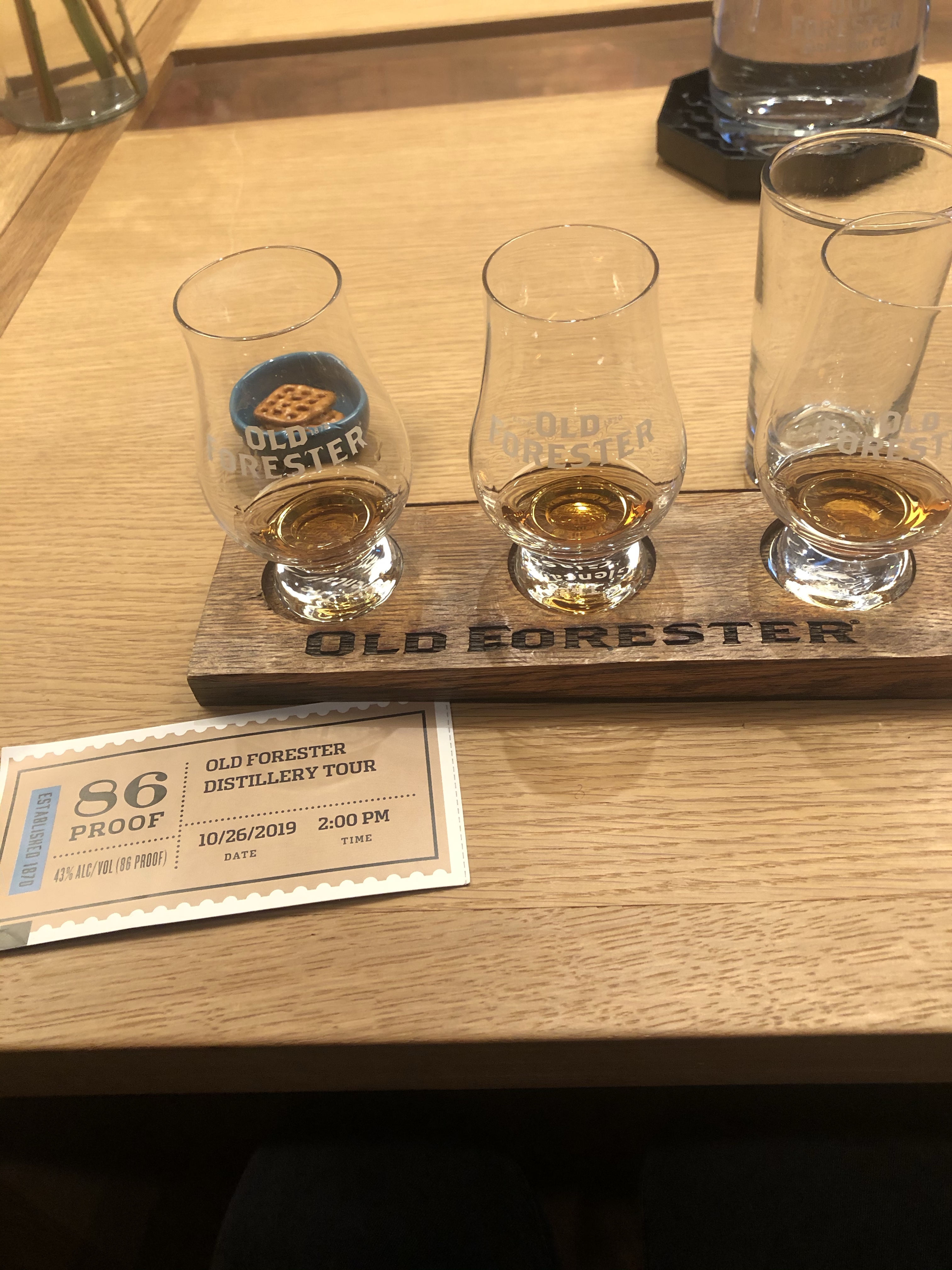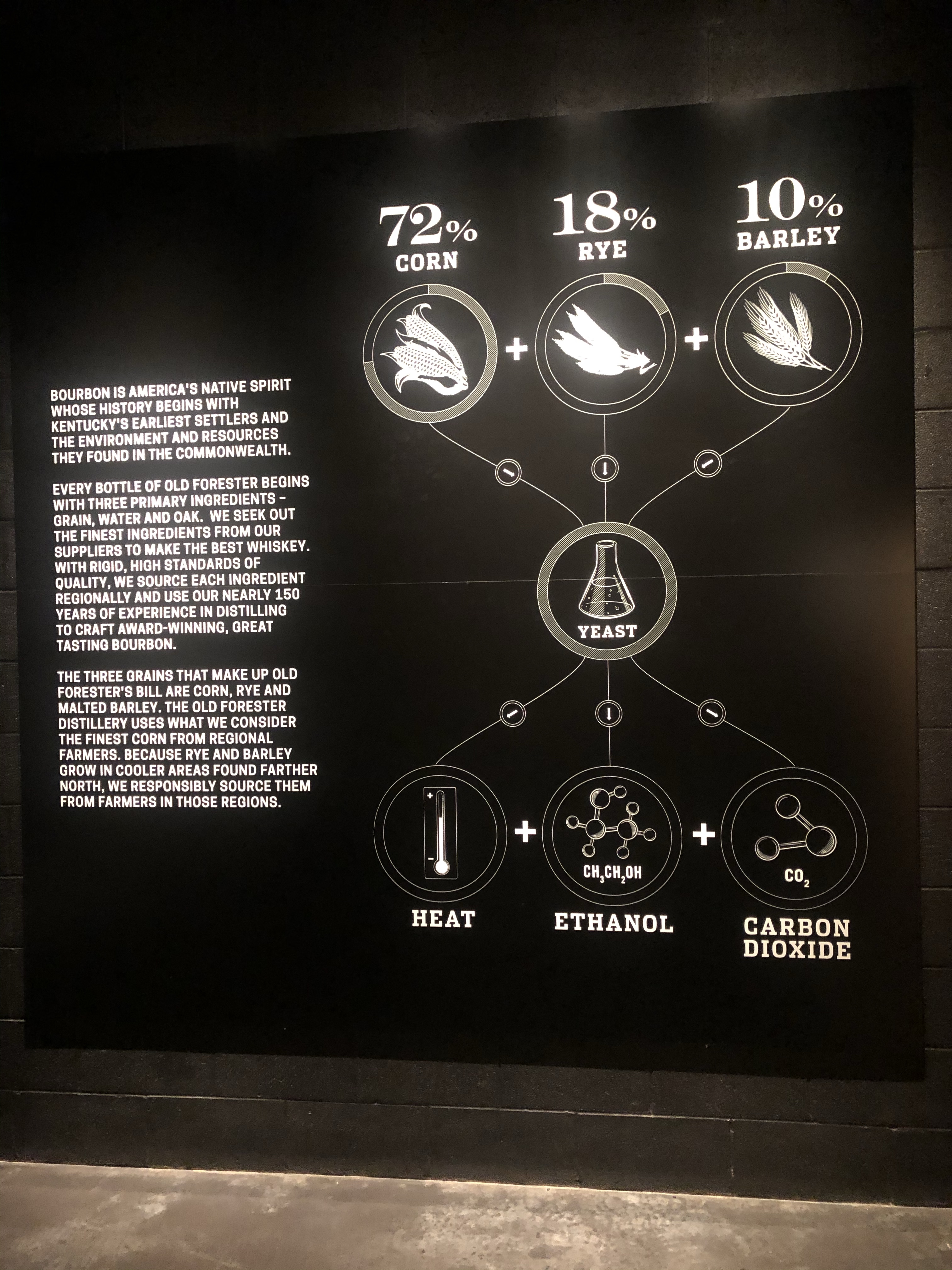 My final tour stop Saturday was Old Forester. They were the first bottled bourbon. I’m a nerd so I loved learning about the chemical process. There are 5 rules for a whiskey to be officially called a bourbon. The first rule of bourbon is that it must be made in the United States. While 95% of the world’s bourbon supply is made in Kentucky, it’s not all there. 2. Aging must take place in a new, charred, oak barrel. 3. The mash must be at least 51 percent corn. 4. The whiskey cannot enter the barrel at higher than 125 proof. It cannot enter the bottle at a proof less than 80. 5. Nothing can be added but water and only to lessen the proof when necessary. Other whiskeys can add color and flavor. Not bourbon, it must be au natural.